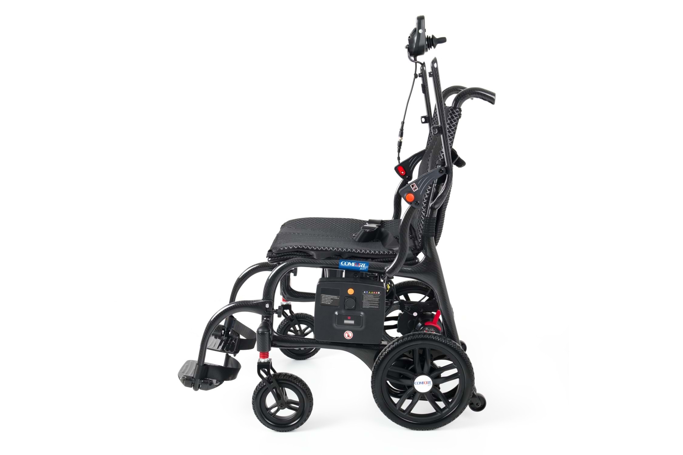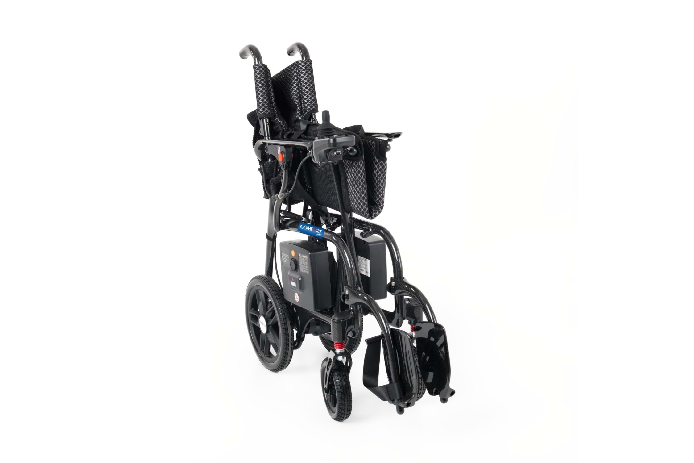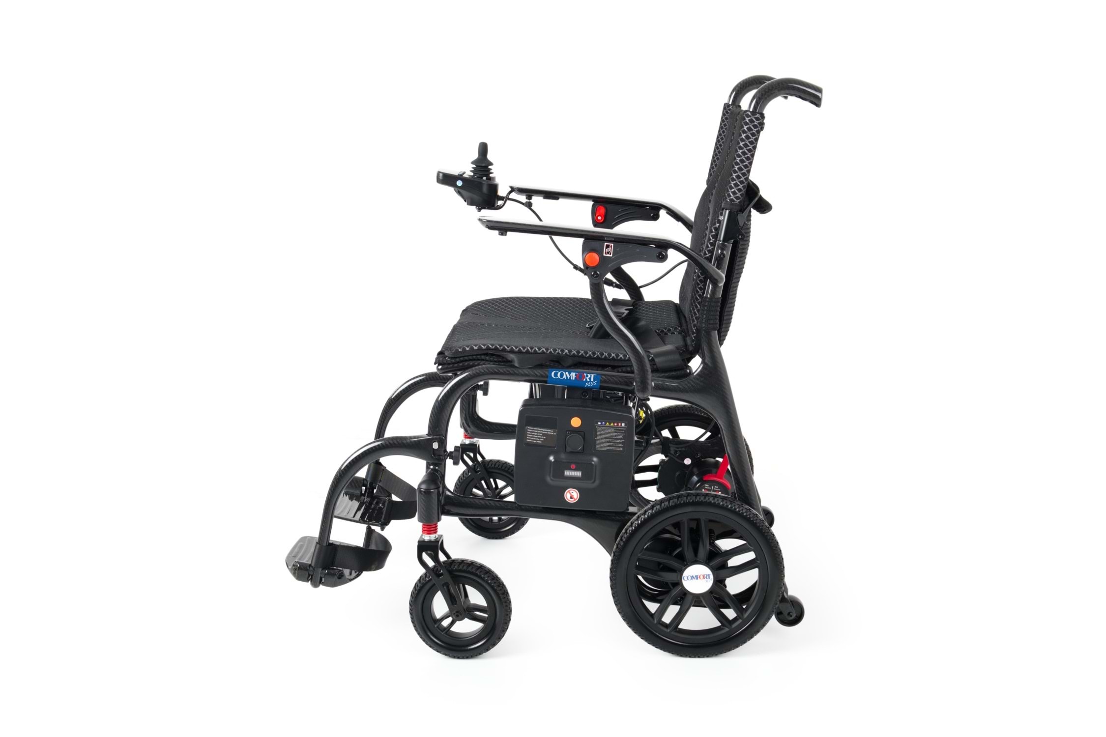 Comfort Plus DY01107 Karbon Lityum Pilli Akülü Tekerlekli Sandalye – Ultra hafif karbon fiber gövdesi ile güç, dayanıklılık ve konforu bir arada sunar. Katlanabilir tasarımı, uzun ömürlü lityum pil teknolojisi ve joystick kontrollü sürüş sistemiyle şehir içi ve seyahat kullanımına mükemmel uyum sağlar. Hafif, sağlam ve taşınabilir yapısıyla günlük hayatınızı kolaylaştırır.