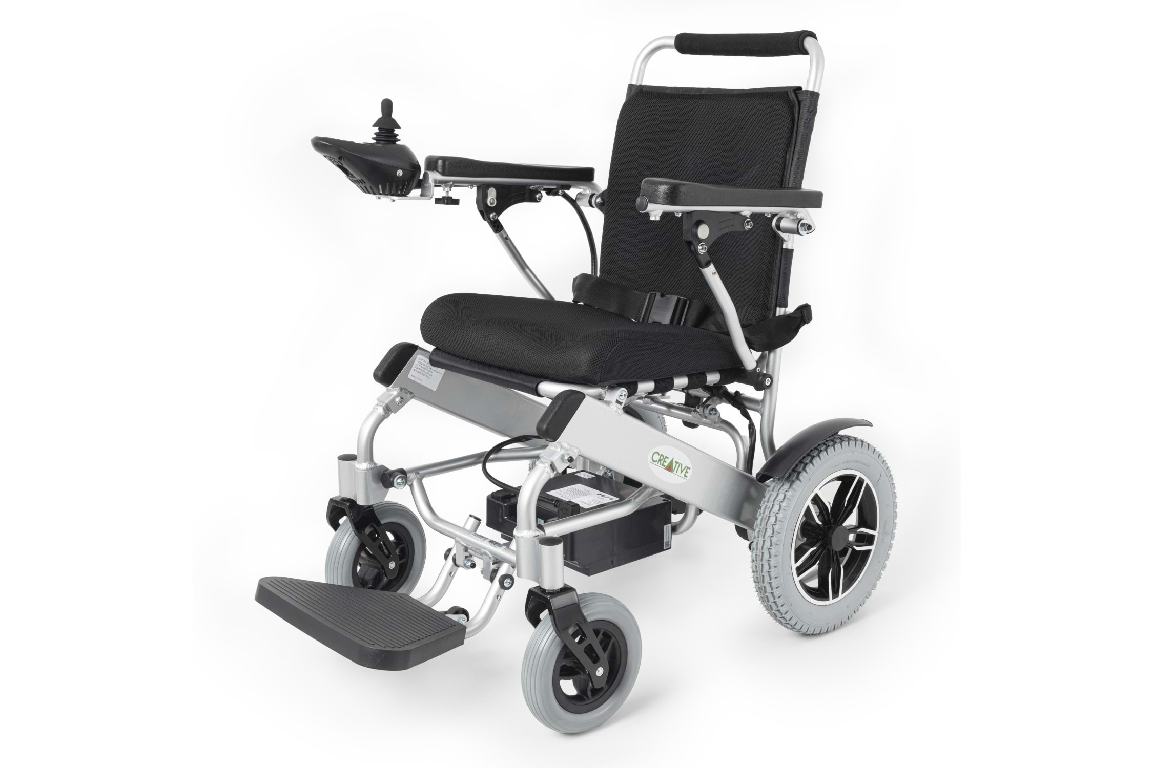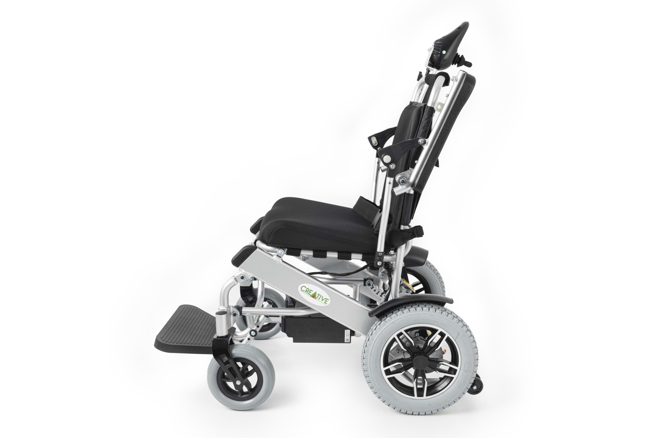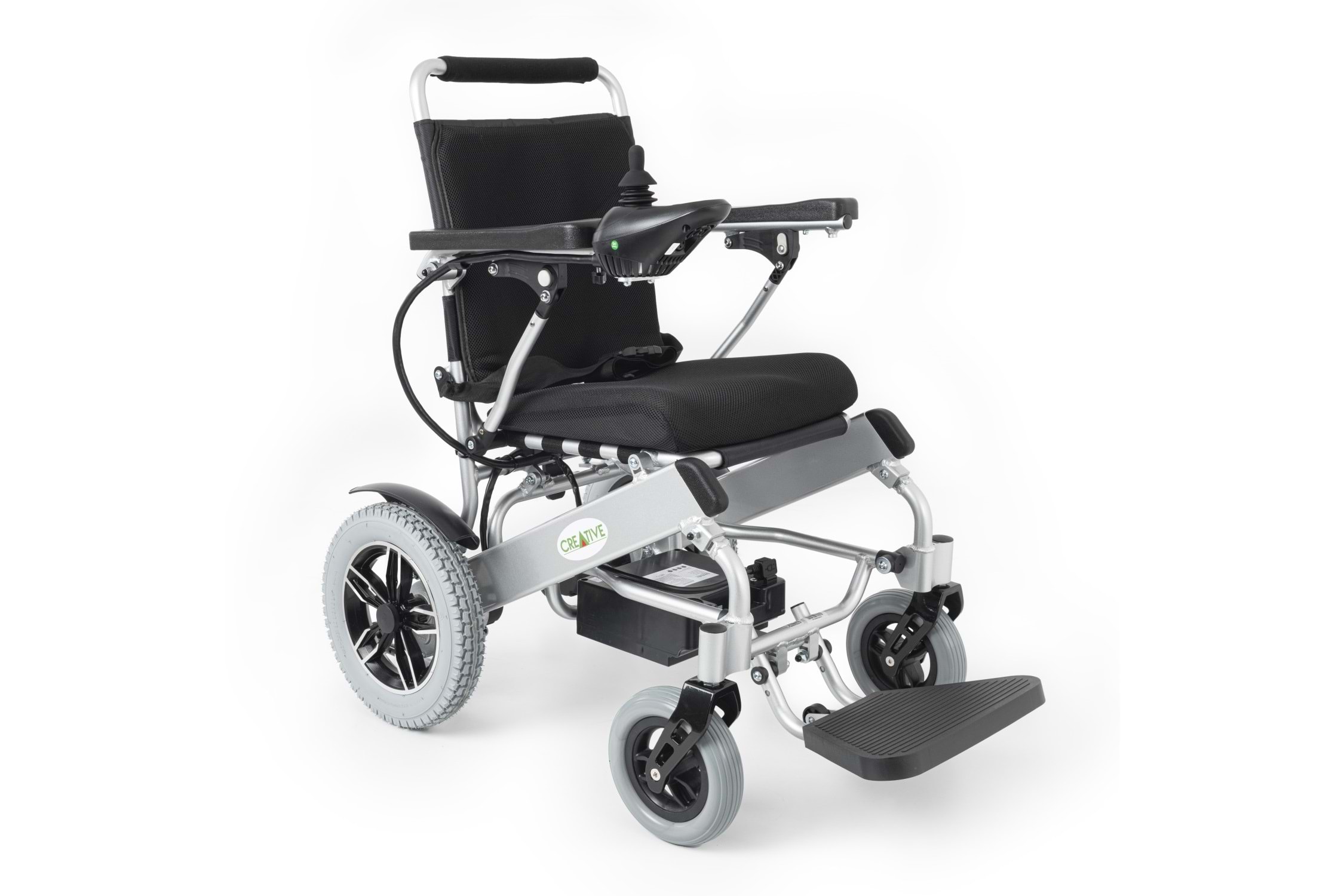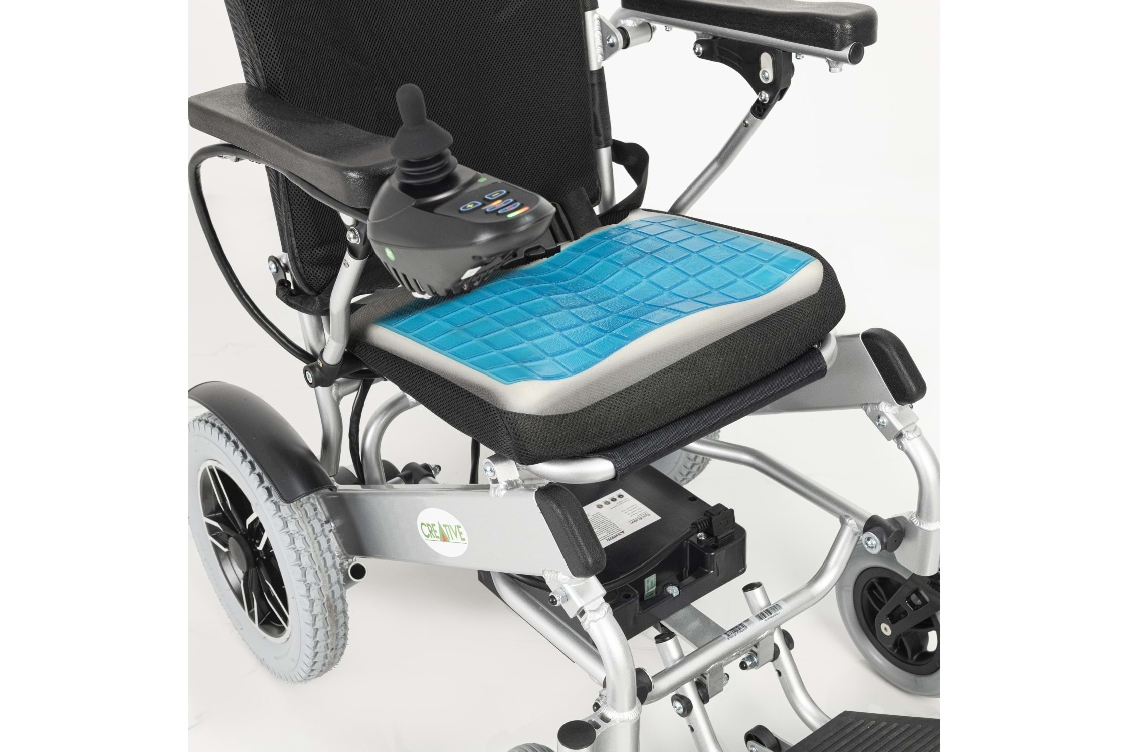 Creative CR-6012 akülü tekerlekli sandalye; 12 Ah lityum pil, 100 kg kapasite, katlanabilir tasarım, visco jel minder ve joystick kontrol ile üstün konfor sunar.